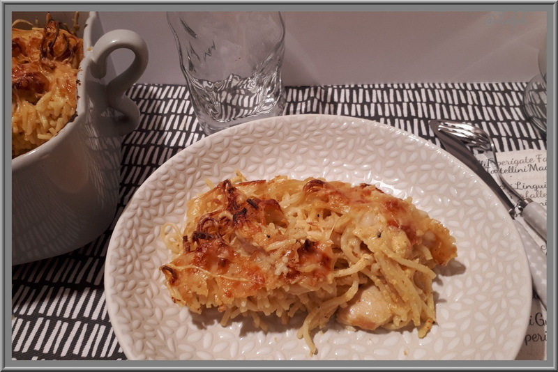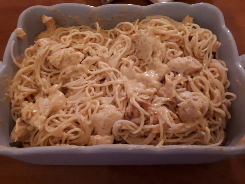 - Frotter une gousse d’ail sur un plat à gratin et y verser les pâtes, puis napper le tout de sauce avec le poulet, mélanger, parsemer de Comté râpé.