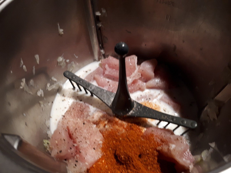 - Éplucher et couper l’oignon en 2 le mettre dans le bol et mixer 5sec/vit5, ajouter le beurre, puis faire chauffer 3min/100°C/vit1, ajouter la farine puis poursuivre la cuisson 3min/100°/vit1, insérer le fouet, puis mettre les lanières de poulet, les épices cajun le sel et le poivre, répartir harmonieusement le poulet de tous les côtés du fouet, faire chauffer 6min/90°C/couteau inversé/Vit mijotage, à la sonnerie, mélanger avec la spatule pour que le poulet se retourne puis poursuivre la cuisson 3min/90°C/couteau inversé/Vit mijotage.
