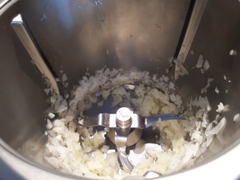 - Éplucher et couper votre oignon en deux, le mettre dans le bol et mixer 5sec/vit5, racler les bords, ajouter l’huile d’olive et faire revenir 4min/90°C/vit mijotage.
