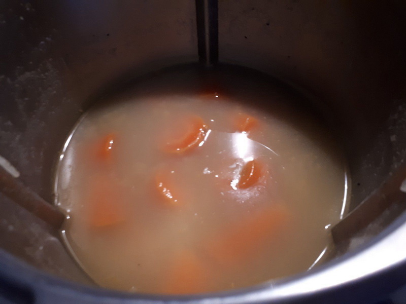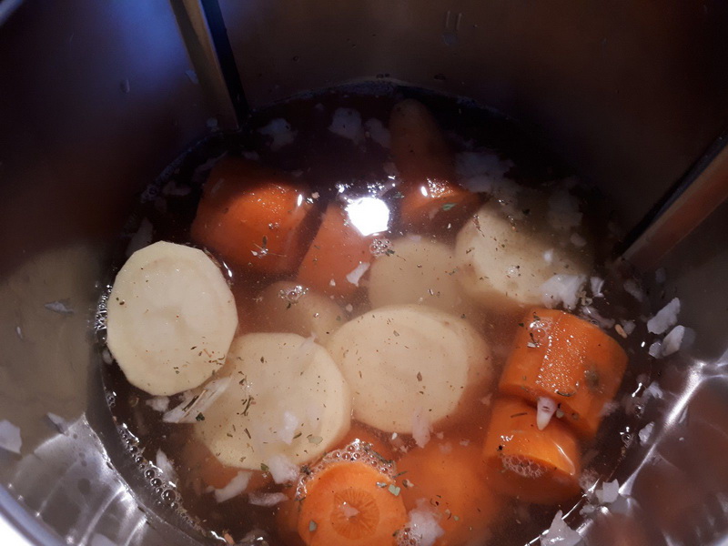 - Éplucher vos carottes et votre pommes de terre puis les laver et les couper en gros morceaux, les ajouter dans le bol avec l’eau, les épices, le sel et le poivre puis faire chauffer 18min/varoma/Vit mijotage.