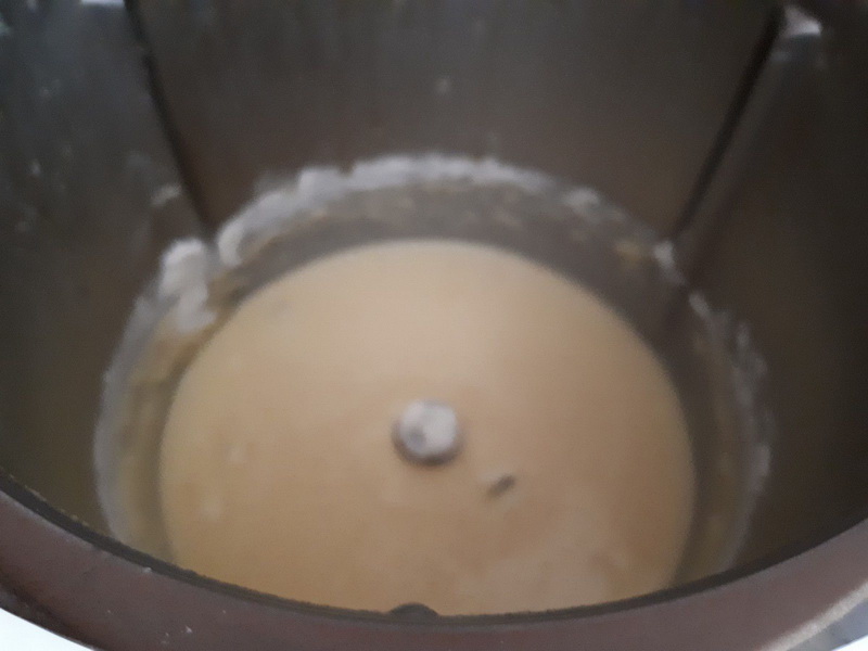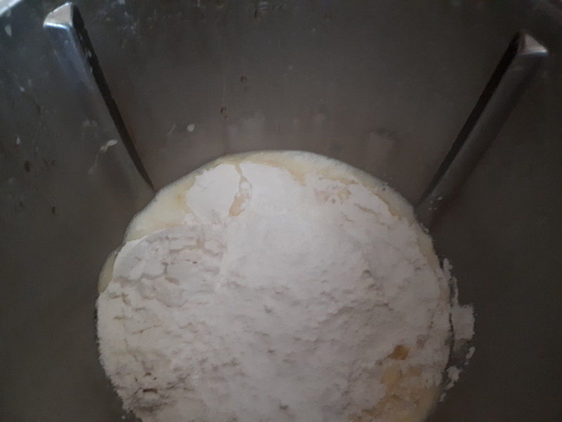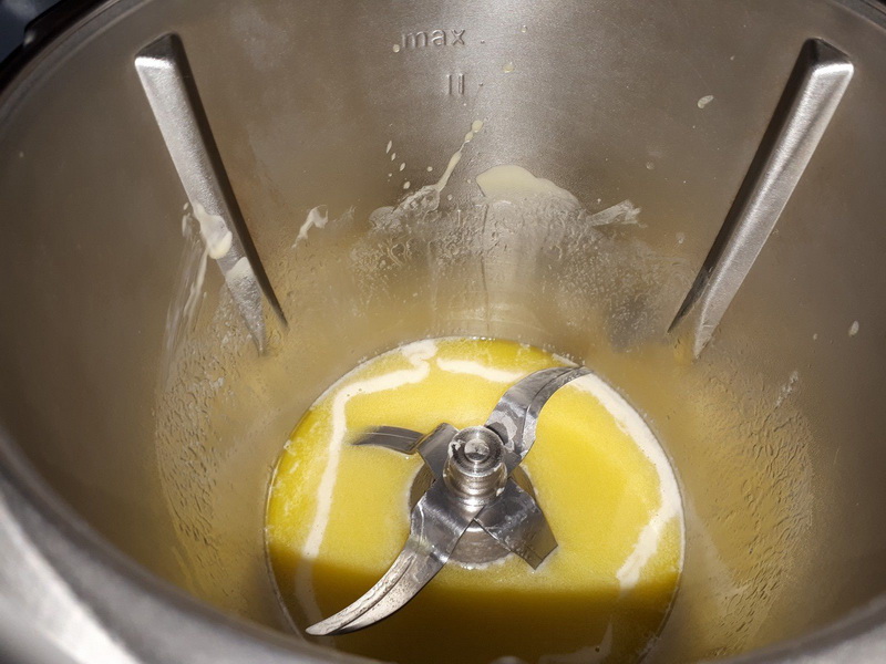 - Mettre le beurre dans le bol puis faire chauffer 2min/90°C/vit 2, à la sonnerie laisser tiédir quelques minutes puis ajouter le lait et les œufs mélanger 30sec/Vit4.