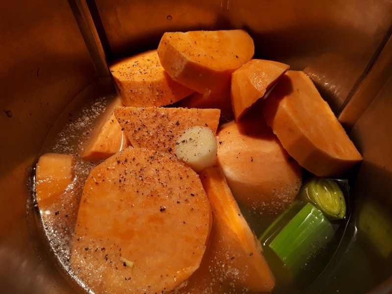 - Couper votre poireau en rondelles, puis le laver, éplucher et couper votre patate douce en cubes, éplucher votre petit bout de gingembre; mettre le tout dans le bol de votre thermomix puis couvrir avec votre bouillon de légumes, saler et poivrer.