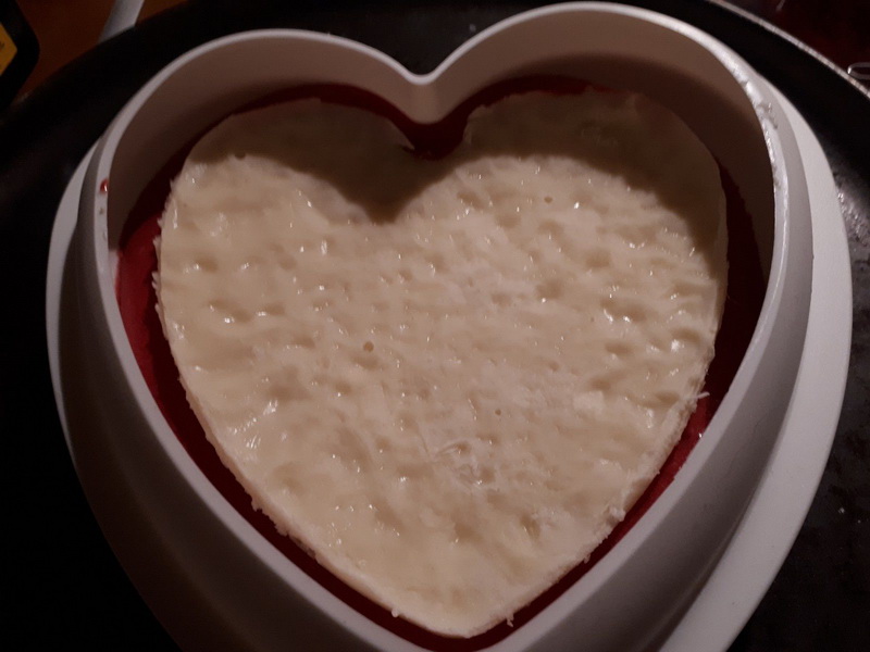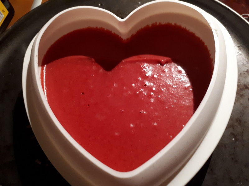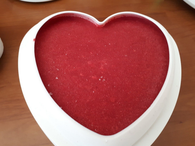 - Mettre les 2/3 de la mousse dans votre moule cœur, placer au frais environ 1 heure, puis placer votre panna cotta congelée et recouvrir avec le reste de mousse.
