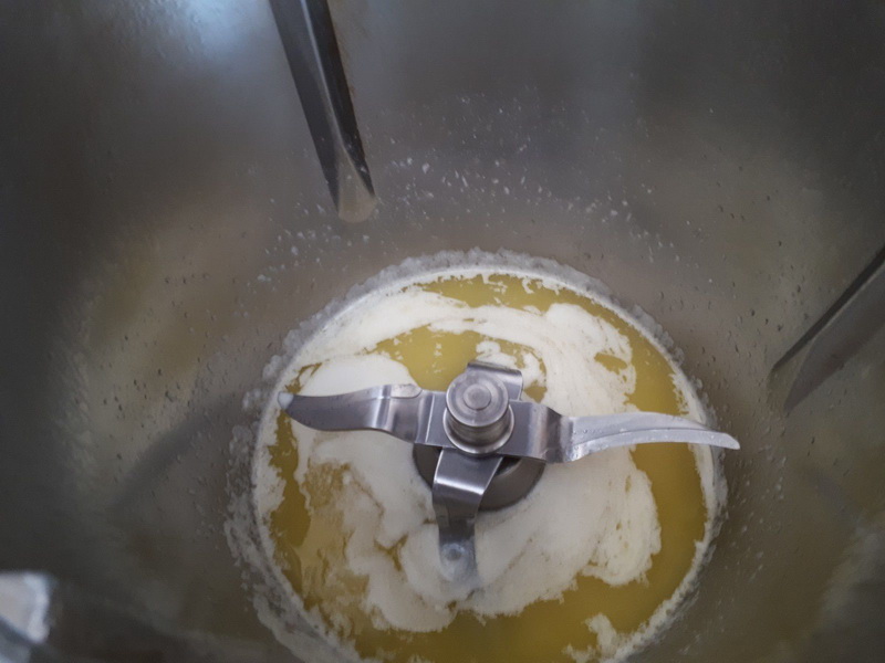 - Mixer le tout au mixeur plongeant, en laissant bien le pied au fond du récipient pour ne faire faire trop de bulle. .