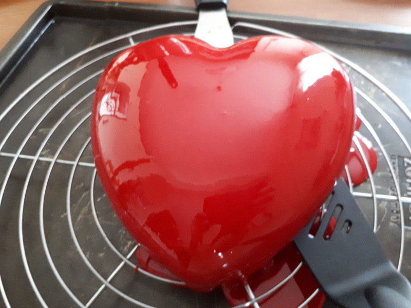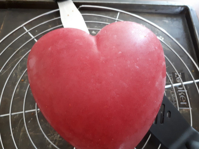Pour le nappage, je vous conseille de mettre votre entremets congelé sur une volette avec deux spatules sous l’entremets cela sera plus facile pour le mettre sur votre plat de présentation.