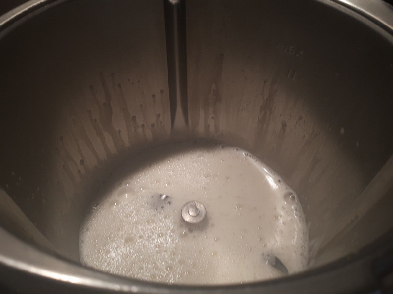 - Mettre la crème, le lait d’amande, le sucre, dans le bol puis faire chauffer 5 min/100°C/Vit2.