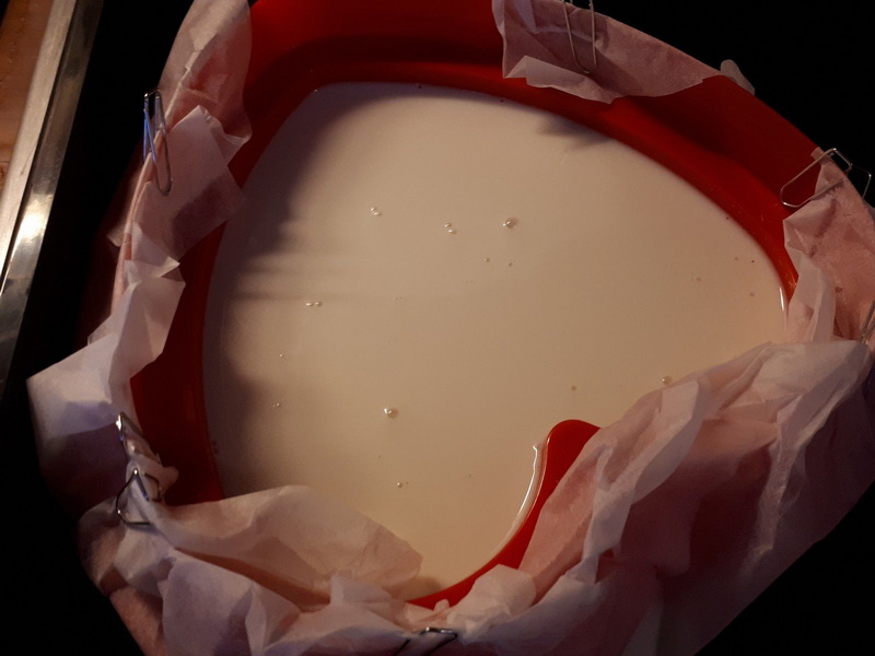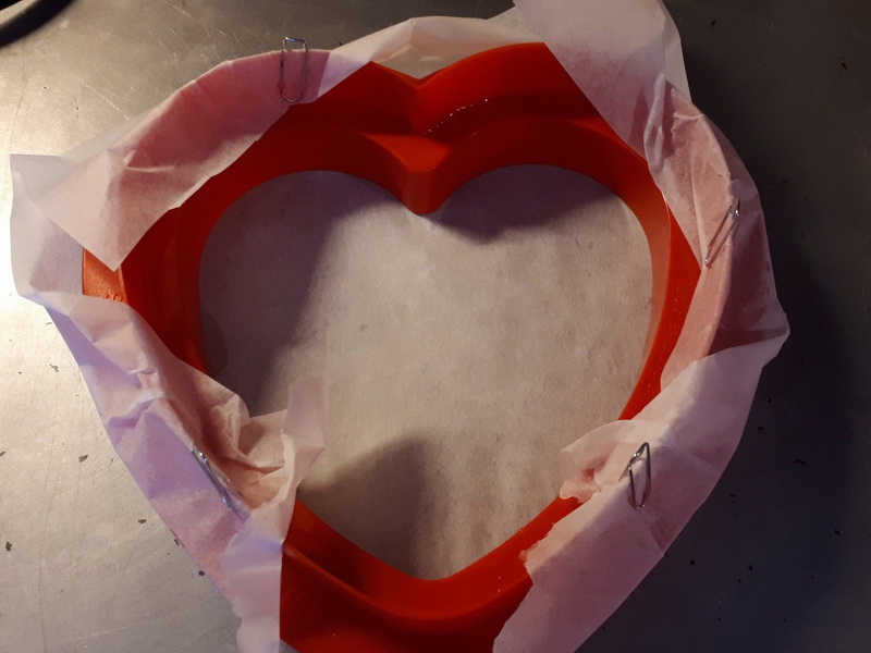 - Verser dans votre moule découpoir, il faudra le placer dans du papier sulfurisé et bien le maintenir coller au découpoir, j’ai pris des trombones, (cela a coulé un peu mais ce n’est pas trop grave) laisser refroidir puis passer au congélateur.