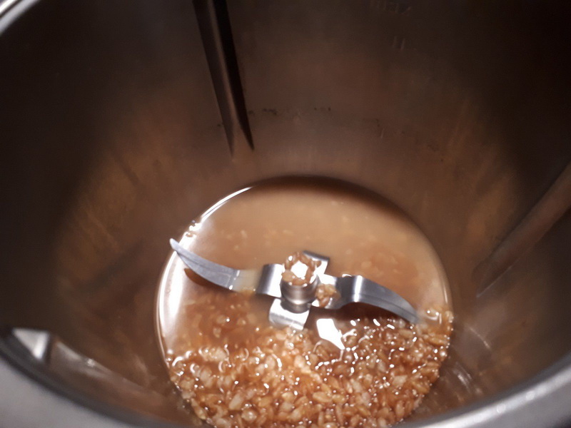 - La veille, mettre le petit épeautre à tremper dans un saladier rempli à hauteur. Le lendemain, mettre dans le bol l’épeautre (sans l’eau de trempage), 500 g d’eau, le cube de bouillon, puis faire cuire 25min/Varoma/couteau inversé/vit mijotage.