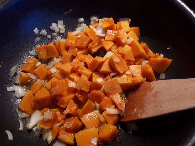 - Laver le potimarron, inutile de l’éplucher s’il est bio. Le couper en gros dés. Peler et émincer votre oignon, poêler le potimarron et l’oignon dans un peu d’huile d’olive.