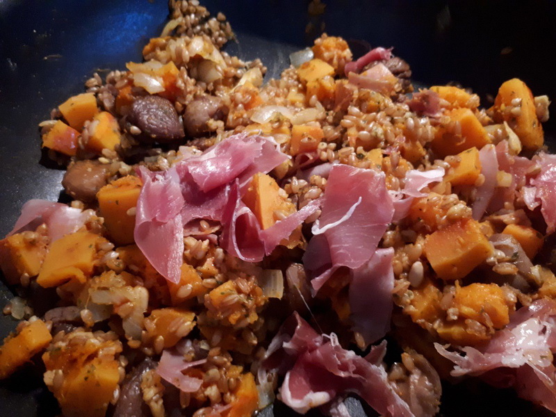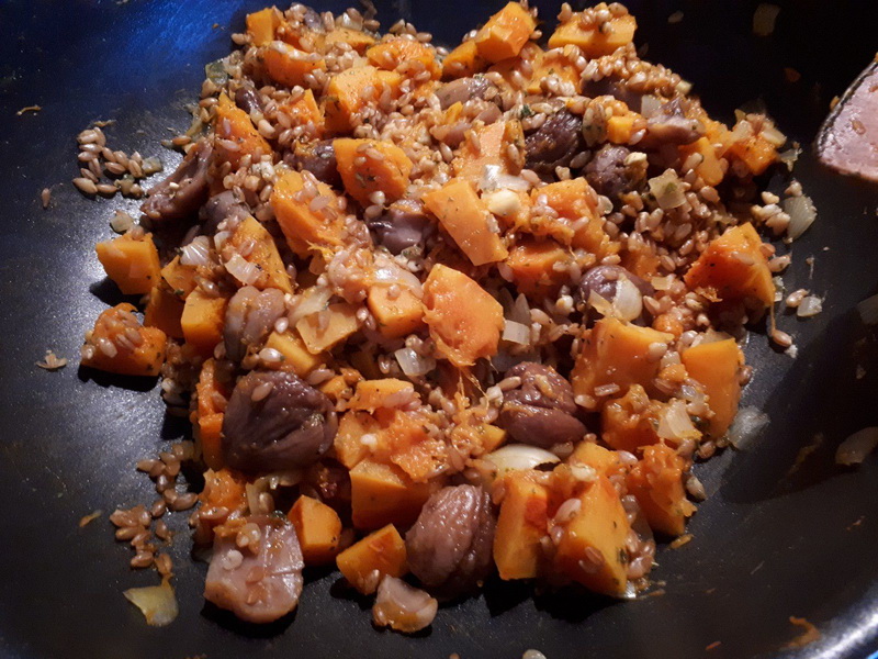 - Pendant ce temps, cuire les châtaignes dans de l’eau bouillante, les ajouter à la poêlée, parsemez de persil ciselé. Au dernier moment, verser le petit épeautre sur les légumes et des lanières de jambon.