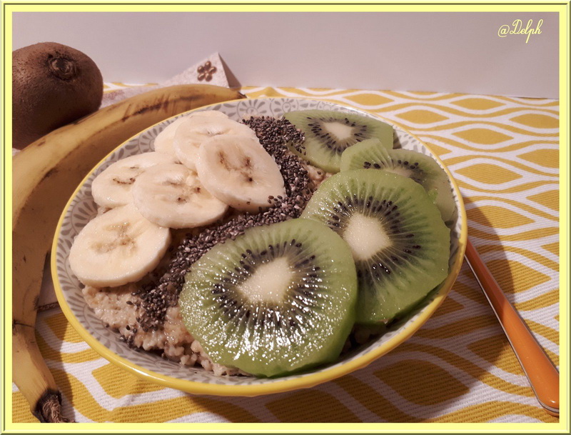 - Verser le porridge dans deux assiettes creuses, disposer une moitié de banane coupée en rondelles, une moitié de Kiwi, coupé en rondelles, et parsemer de graines sur chaque assiette.