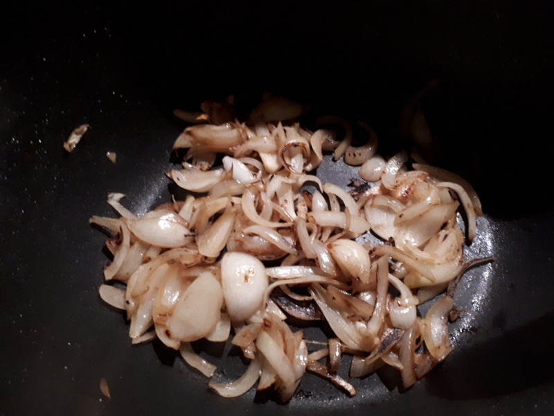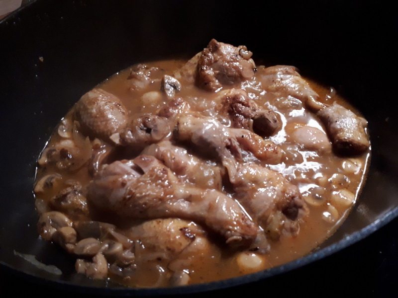 - Émincer les oignons, les faire revenir dans la cocotte du poulet.