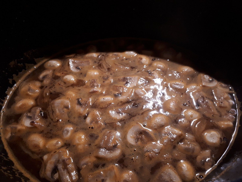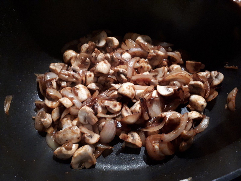 - Laver et couper les champignons en deux, ou quatre si ils sont gros, ajouter aux oignons et faire revenir.