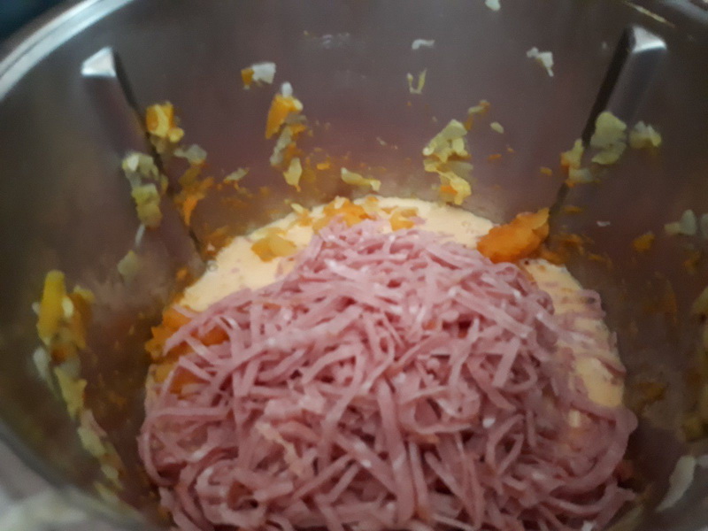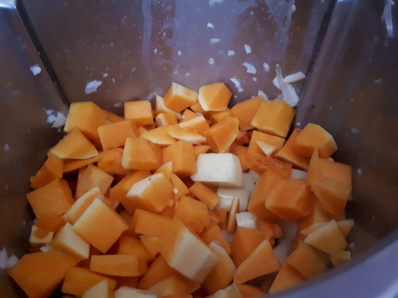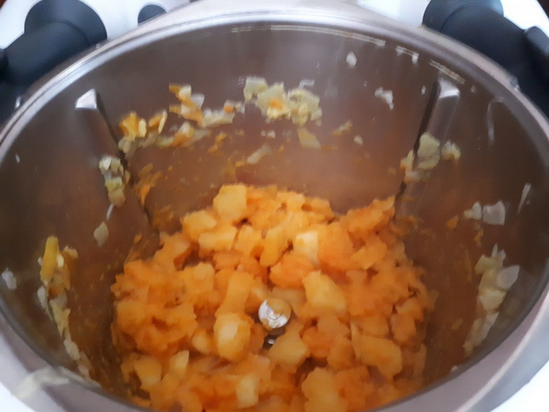 - Éplucher vos pommes de terre, votre butternut et couper le tout en petits dés, les ajouter dans le bol avec l’huile d’olive et faire cuire 15min/100°C/couteau inversé/vit mijotage, à la sonnerie ajouter la crème réservée, le jambon et faire chauffer 3 min/100°C/couteau inversé/vit mijotage, à la sonnerie, donner un coup de spatule pour bien intégrer le jambon