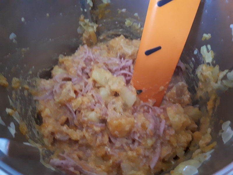 - Lorsque vos pommes de terre et la courges sont bien fondantes les ajouter à l’oignon, mélanger.