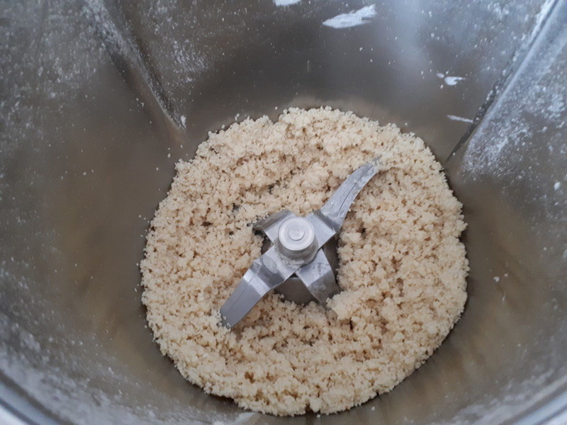 - Nettoyer le bol du Thermomix, puis y déposer la farine, le beurre coupé en morceaux et la chapelure, puis mixer 10sec/vit6.