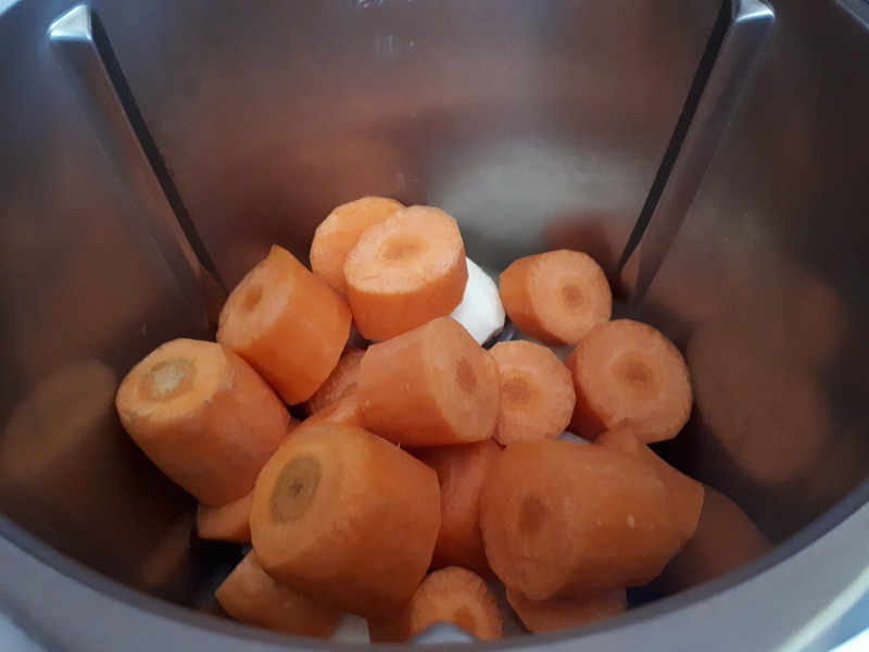 - Éplucher et laver les panais et les carottes, éplucher les gousses d’ail et les dégermer, les mettre dans le bol et mixer 5sec/vit7, réserver, inutile de rincer le bol.