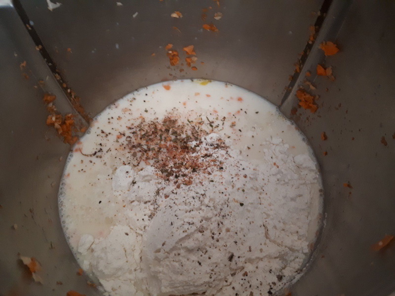 - Mettre les œufs, le lait, la farine, le sel et le poivre puis mélanger 30sec/vit3, ajoutes les légumes râpés puis mélanger à nouveau 30sec/couteau inversé/Vit3.