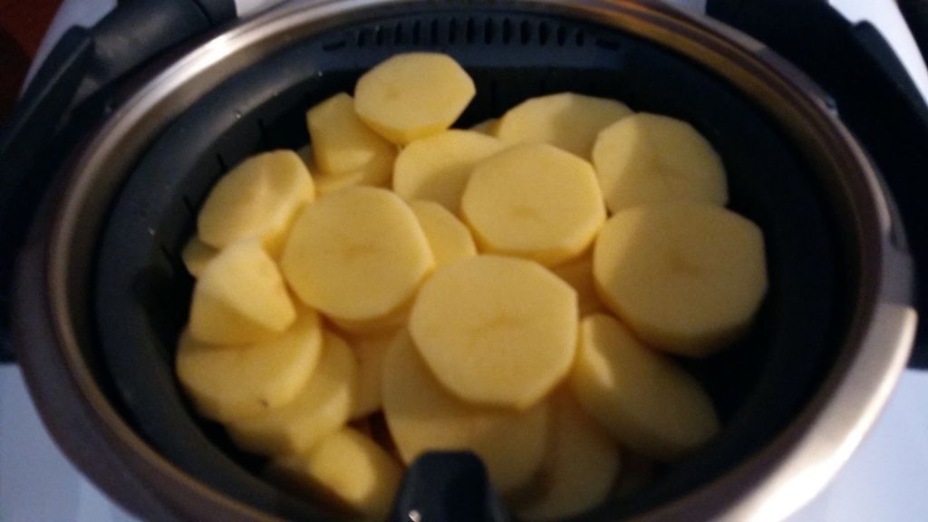 - Éplucher vos pommes de terre et les couper en fine lamelles, les placer dans le panier cuisson ajouter 500g d’eau dans le bol avec un peu de sel et programmer 20min/Varoma/Vit1.