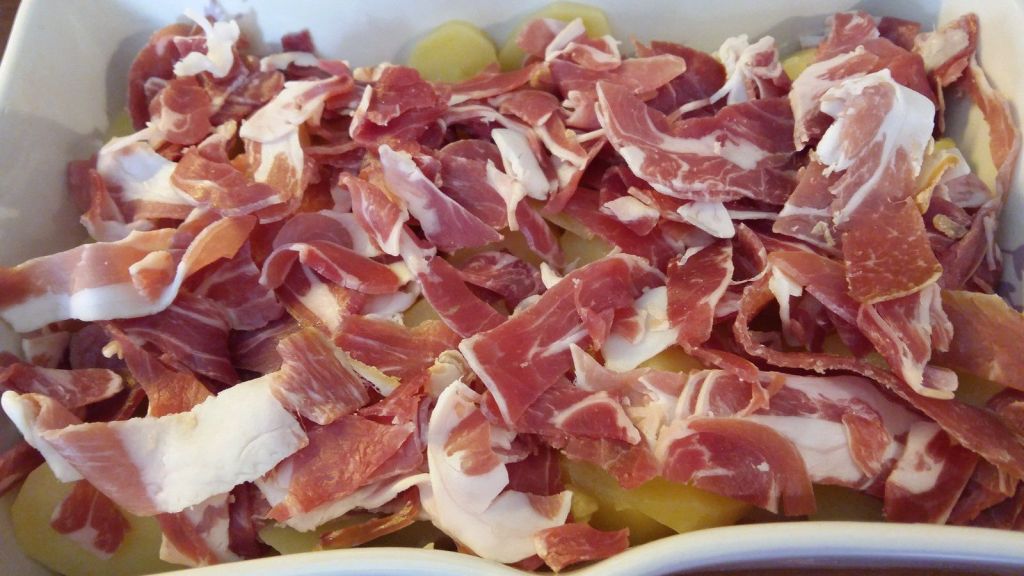 - Disposer une couche de fromage à raclette au fond du plat, recouvrir d’une couche de pommes de terre , puis une couche de jambon sec, disposer les oignons dessus, remettre une couche de pommes de terre, puis une couche de jambon et recouvrir de fromage à raclette.