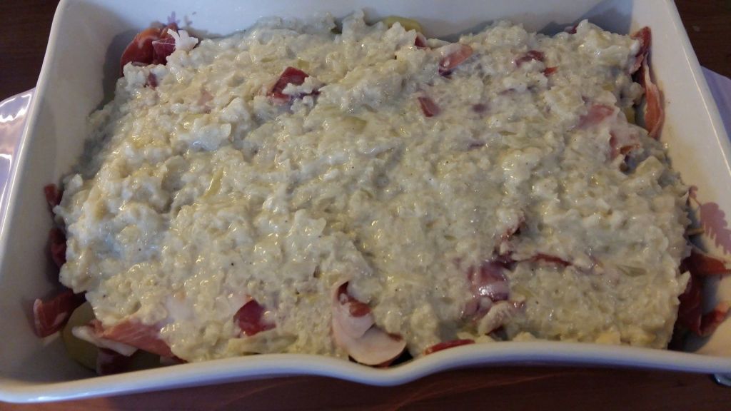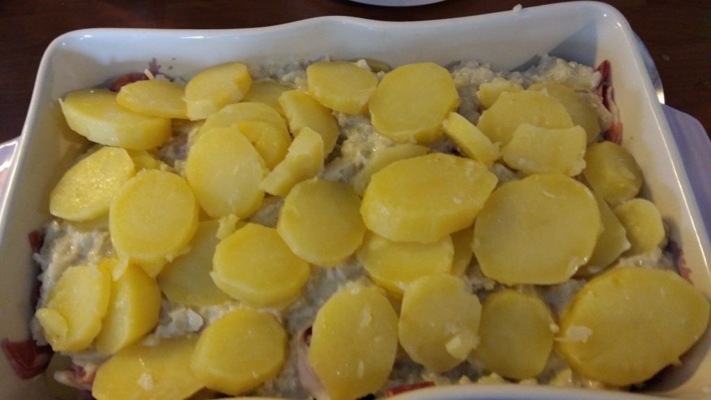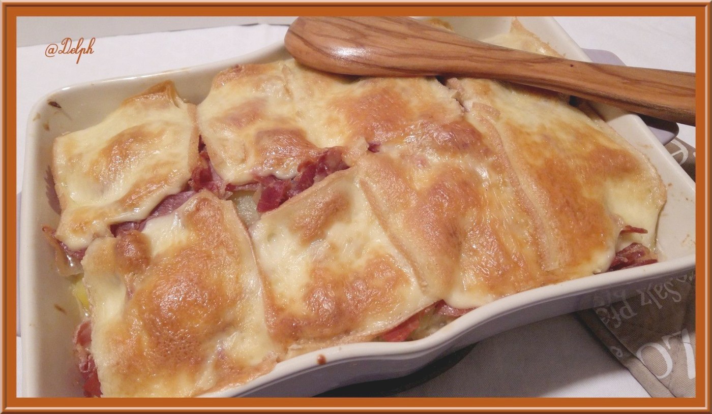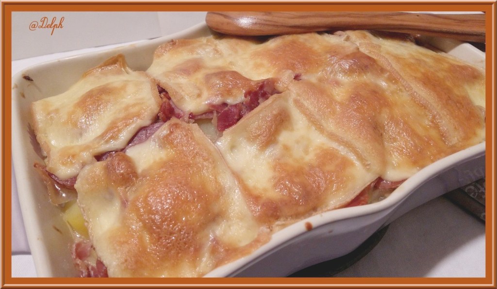 - Disposer une couche de fromage à raclette au fond du plat, recouvrir d’une couche de pommes de terre , puis une couche de jambon sec, disposer les oignons dessus, remettre une couche de pommes de terre puis une couche de jambon et recouvrir de fromage à raclette.