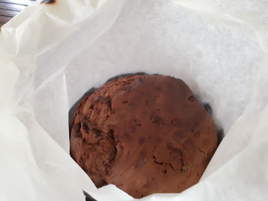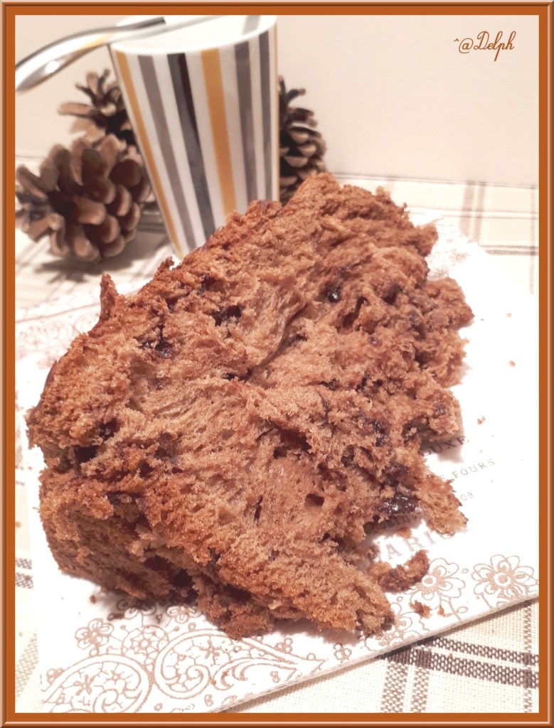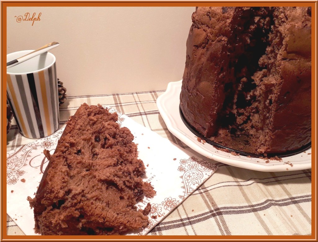 J’ai enfin acheté un moule à Panettone, j’avais très envie d’en réalisé un, et j’ai choisi d’en faire un chocolat. J’ai trouvé une recette sur Notre famille.com, mais je l’ai rendu encore plus chocolaté en doublant la dose de pépites, j’ai mis 100g de pépites dans ma pâte encore tiède pour que cela fonde gentiment, puis 100g à la fin pour avoir un peu de gourmandise croquante à la dégustation.