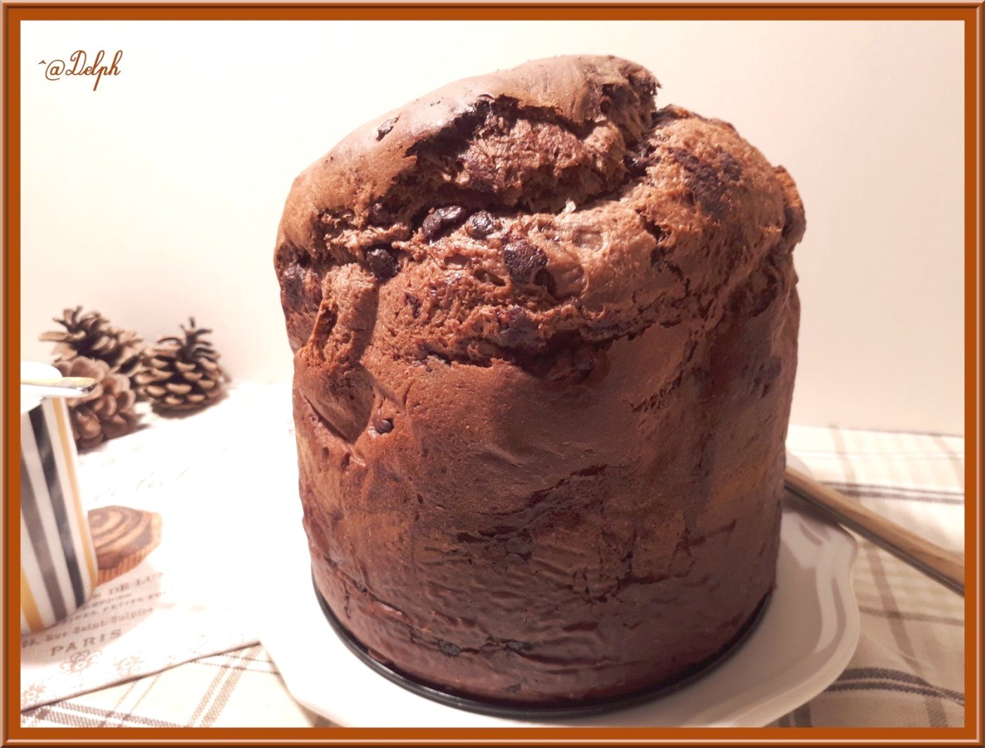 J’ai enfin acheté un moule à Panettone, j’avais très envie d’en réalisé un, et j’ai choisi d’en faire un chocolat. J’ai trouvé une recette sur Notre famille.com, mais je l’ai rendu encore plus chocolaté en doublant la dose de pépites, j’ai mis 100g de pépites dans ma pâte encore tiède pour que cela fonde gentiment, puis 100g à la fin pour avoir un peu de gourmandise croquante à la dégustation.