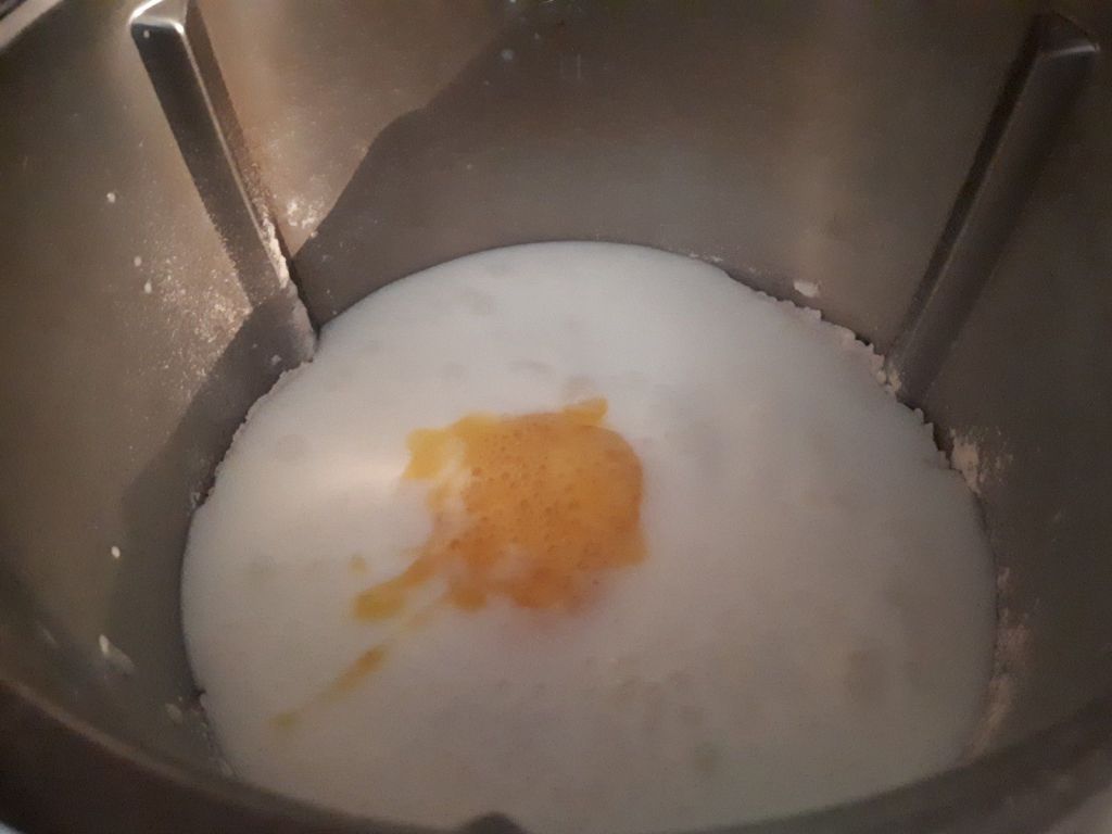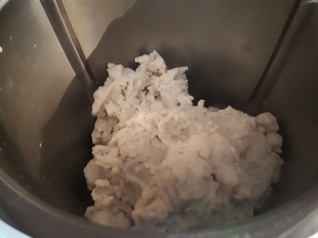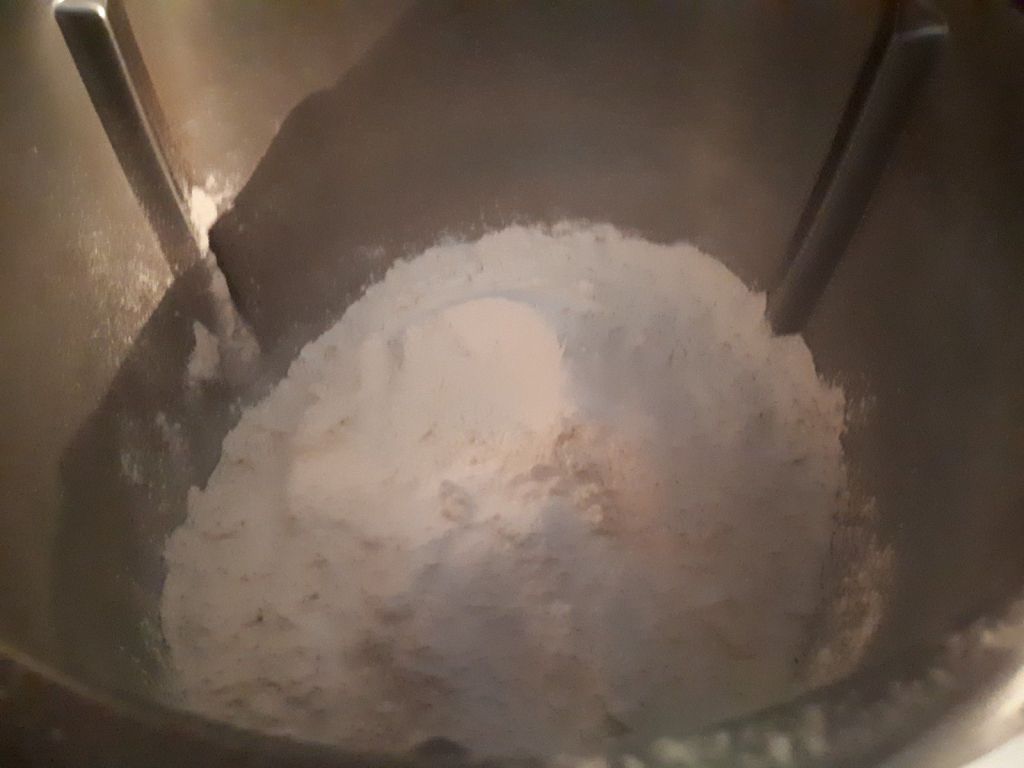 - Placer dans le bol de votre Thermomix les farines, le sel, le bicarbonate de sodium et la levure, mélanger 30sec/vit3, ajouter le lait ribot et l’œuf battu puis mettre en mode pétrin 3min.