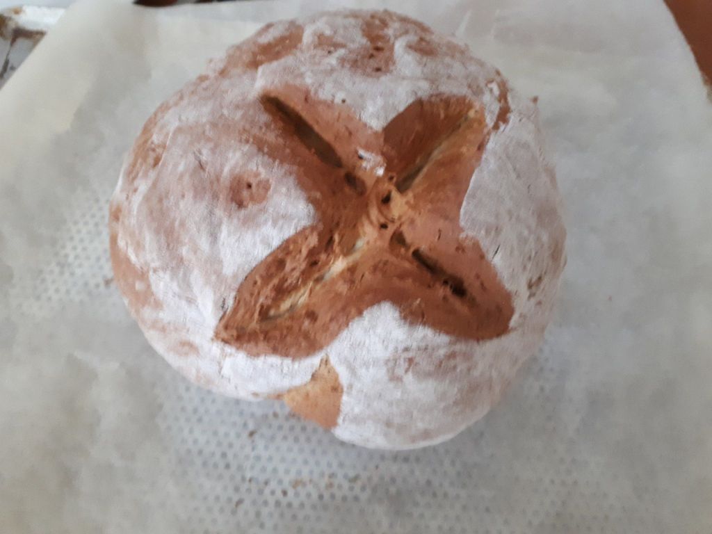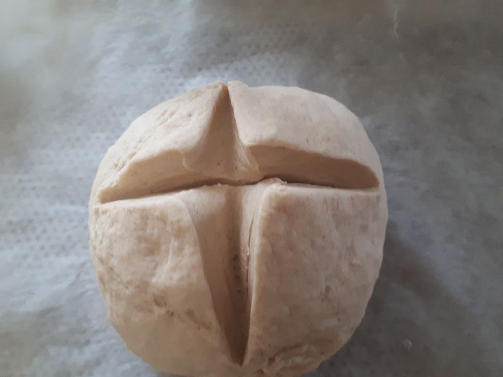 - Sur un plan de travail fariné, pétrir la pâte jusqu’à ce qu’elle devienne lisse. Donnez-lui une forme ronde et placez-la sur une plaque de cuisson. Tracer une croix sur le dessus du pain, puis le placer au four pendant 15 minutes au bout de ce temps diminué la température à 200°C, et laisser le encore 15 minutes. Retourner le pain et laisser cuire encore 5 minutes (il doit être légèrement coloré et sonner vide, creux, quand on tape dessus).