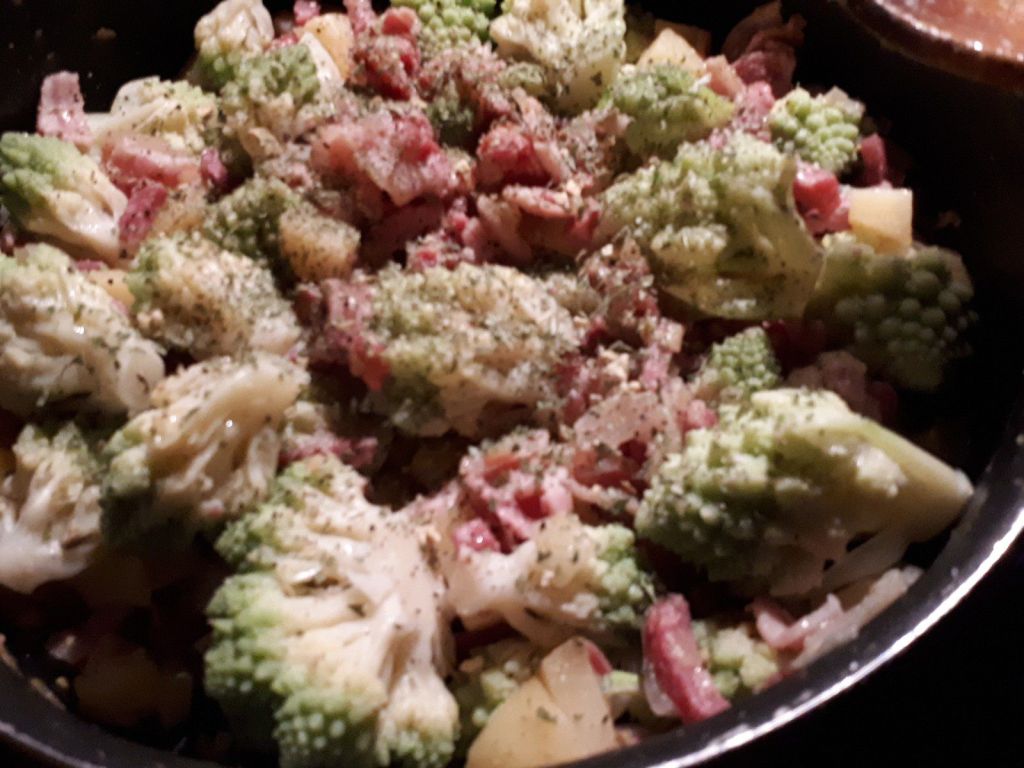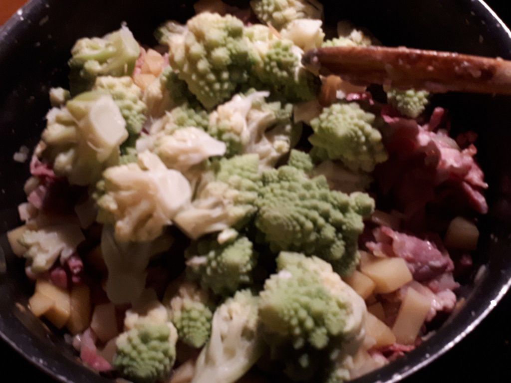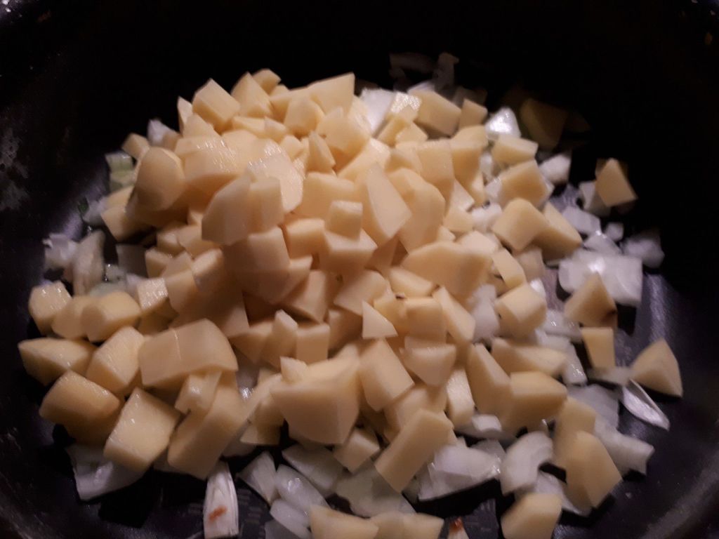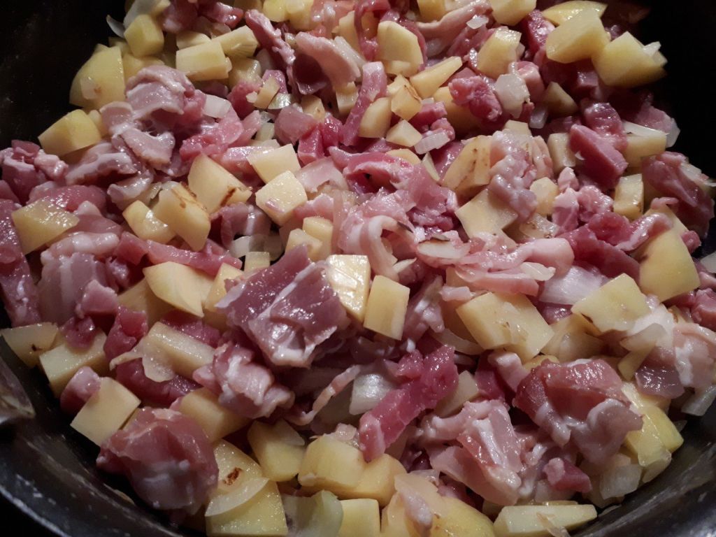 - Éplucher et ciseler vos oignons, les faire revenir pendant 2 minutes avec une noix de beurre, ajouter vos pommes de terre lavées épluchées et coupées en petits dés. Bien mélanger et faire revenir en mélangeant pendant 5 minutes ajouter la poitrine fumée coupée en lanières, continuer la cuisson sur feu moyen pendant 20 minutes en mélangeant régulièrement.
