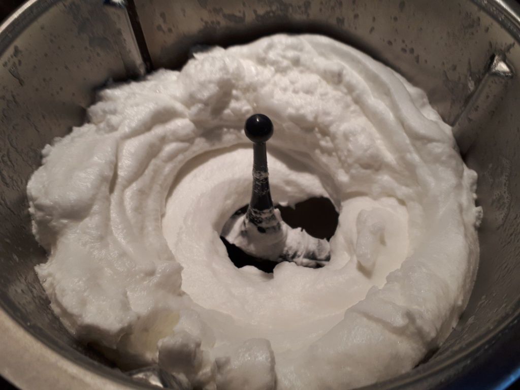 - Mettre les blancs dans le bol du Thermomix puis donner deux coups de turbo, ajouter une pincée de sel, insérer le fouet puis programmer 4 min/Vit3,5 sans le gobelet. A la sonnerie réserver dans un cul de poule, inutile de rincer le bol.