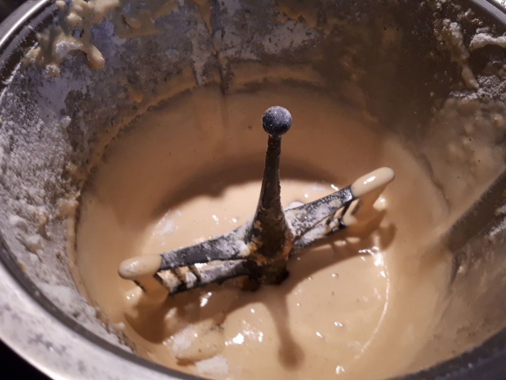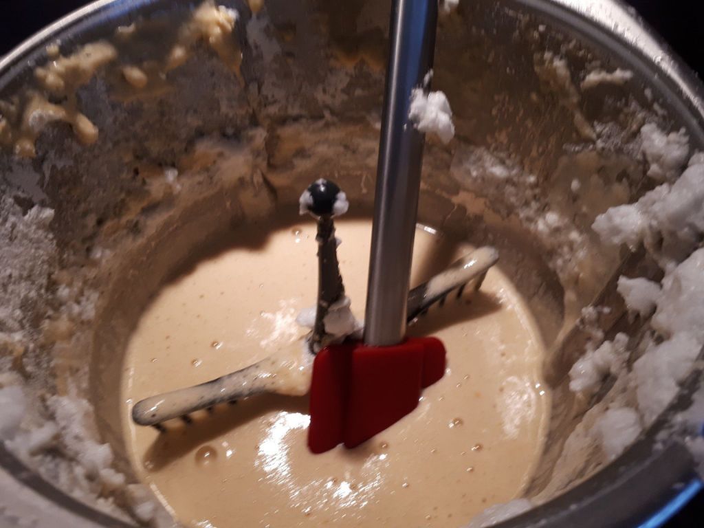 - Ajouter la farine la levure et le lait puis mélanger 30sec/vit3 toujours avec le fouet, puis ajouter les blancs et mélanger 40sec/Vit1 avec le fouet.