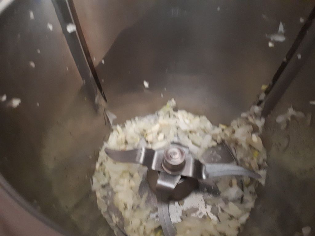 - Couper l’oignon en 4 morceaux, éplucher et dégermer l’ail, les mettre dans le bol et mixer 5sec/vit5.