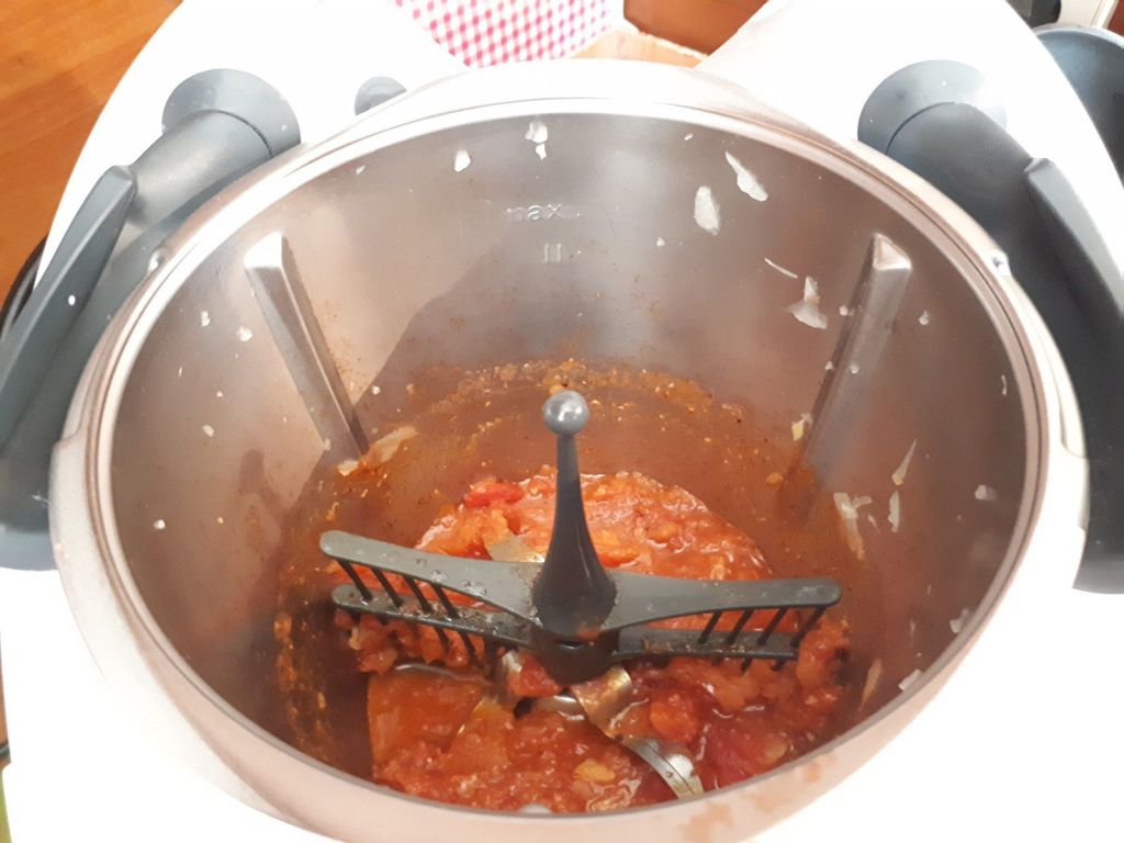 - Insérer le fouet, ajouter les tomates, l’huile d’olives, et le curry dans le bol puis programmer 5 min/Varoma/Vit 1 (tm31) ; ou 5min/115°c/vit1 (TM5).