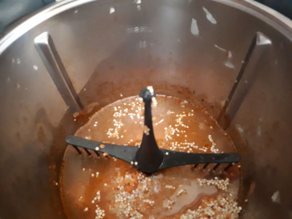 - Pendant ce temps; rincer le quinoa et les lentilles sous l’eau froide, à la sonnerie, ajouter le mélange quinoa et lentilles dans le bol, avec l’eau et le sel puis faire chauffer 12min/100°C/couteau inversé/vit mijotage toujours avec le fouet.