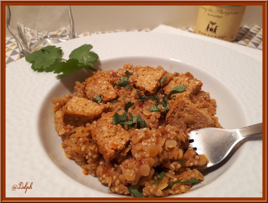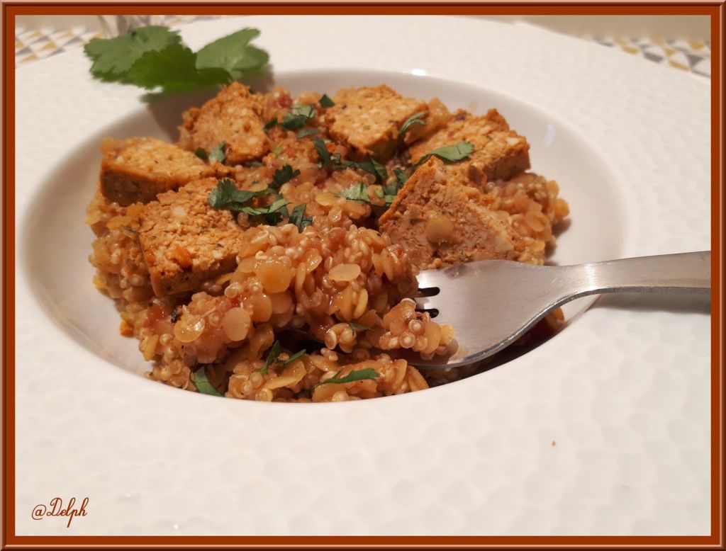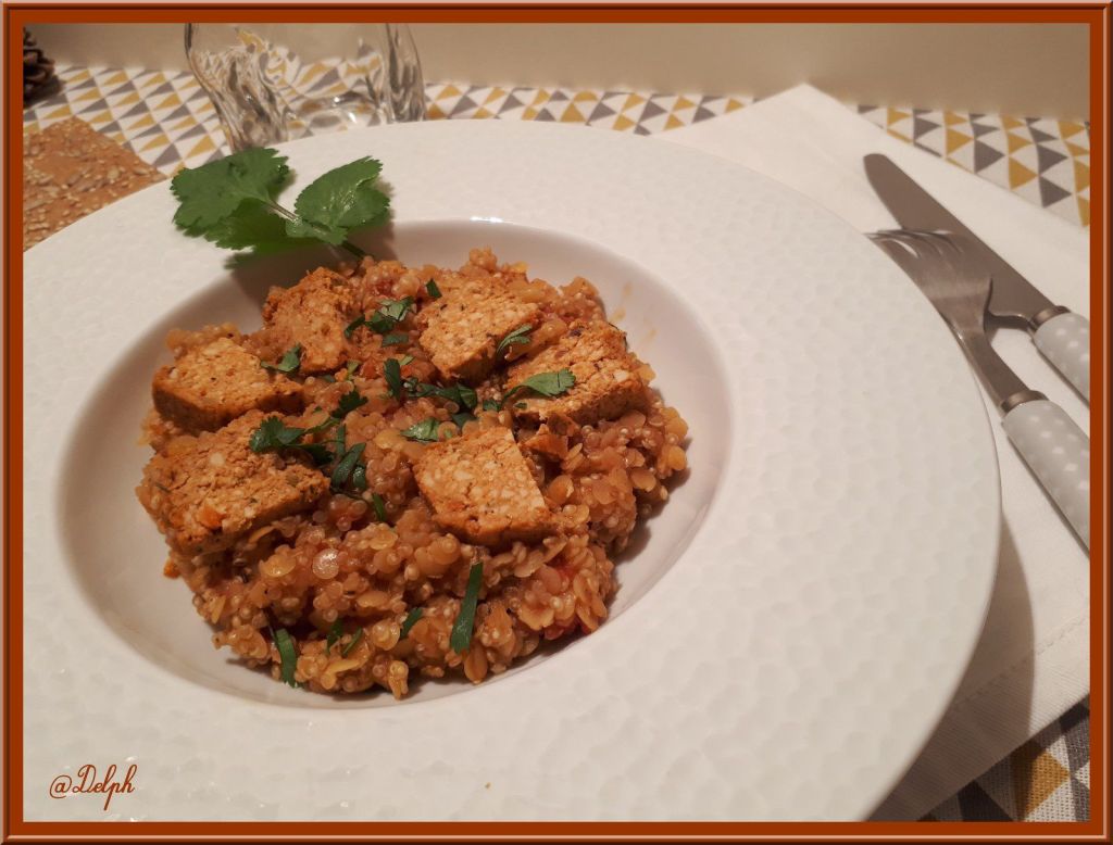 - Au moment de servir, dresser vos assiettes, puis ciseler, un peu de coriandre fraîche, ajouter des dés de Tofu Rosso.