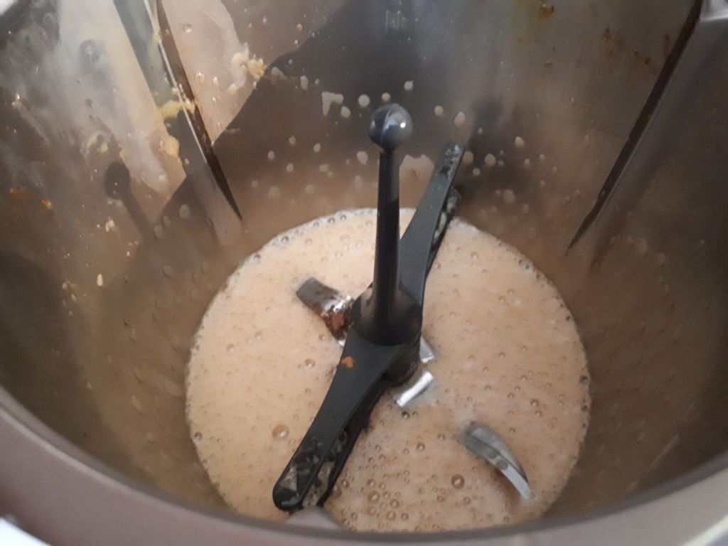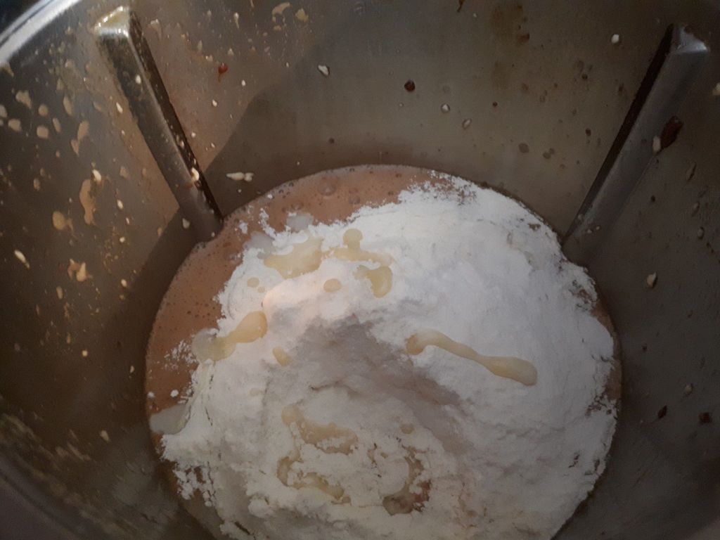 - Insérer le fouet puis mettre les œufs entiers et le sucre puis fouetter 1 min/vit3, à la sonnerie ôter le fouet puis ajouter le mascarpone et la pâte de praliné puis mélanger 30sec/vit3, ajouter la farine, la levure et mélange huile/lait/beurre/miel réservé et mélanger à nouveau 30sev/vit3.
