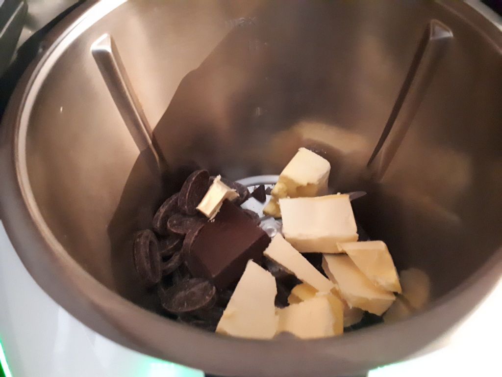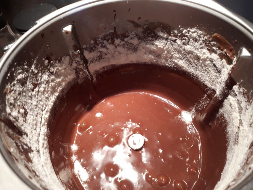 - Mettre les pistoles de chocolat et le beurre dans le bol du Thermomix puis faire fondre 3min30/50°C/vit2, ajouter le lait concentré sucre, les œufs puis mélanger 30sec/vit3, ajouter la farine puis mélanger à nouveau 30sec/vit3.