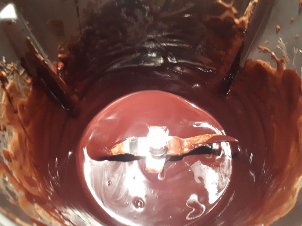 - Incorporer ce mélange au chocolat fondu et beurre, bien mélanger afin d’obtenir une pâte lisse et homogène.