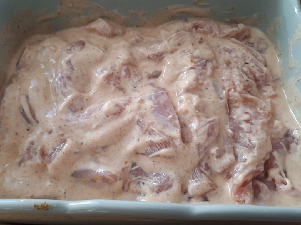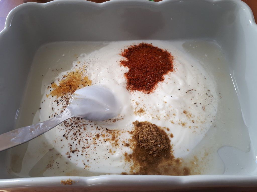 - Dans un plat, mélanger vos yaourts avec les épices, le sel et le poivre, prélever les zestes de votre citron et le jus, les incorporer à la marinade.