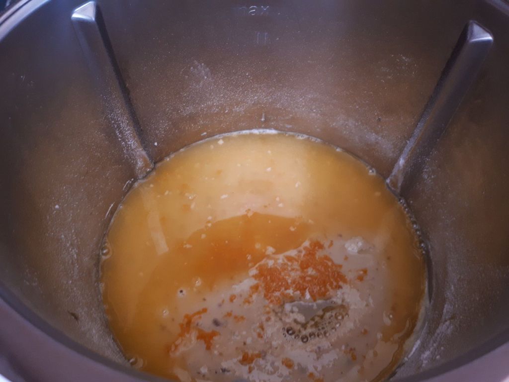 - Mettre le yaourt, les œufs, l’extrait de vanille, le sucre, la farine, la levure avec une pincée de sel et mélanger 30sec/vit3, ajouter les jus de l’orange et les zestes, mélanger à nouveau 30sec/vit3.