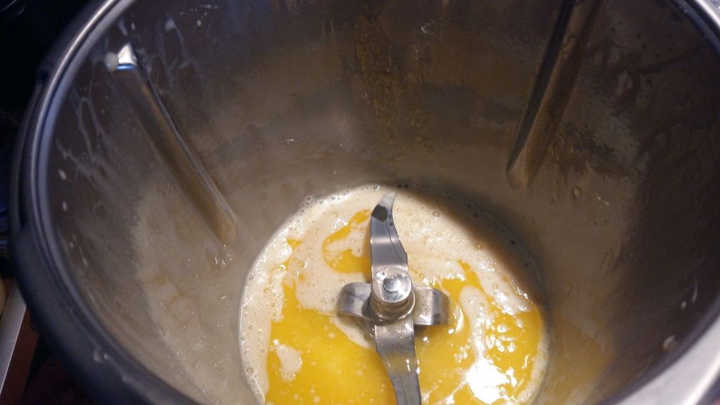 - Mettre l’œuf et le lait dans le bol puis mélanger 40sec/vit 4, ajouter le beurre fondu et refroidi puis mélanger 20sec/vit3.