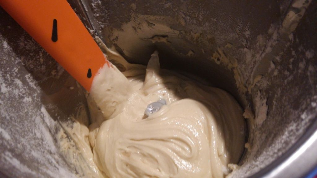 - Ajouter l’alcool de poire, éplucher et couper les poires en petits dés puis les incorporer doucement à la pâte avec la spatule.