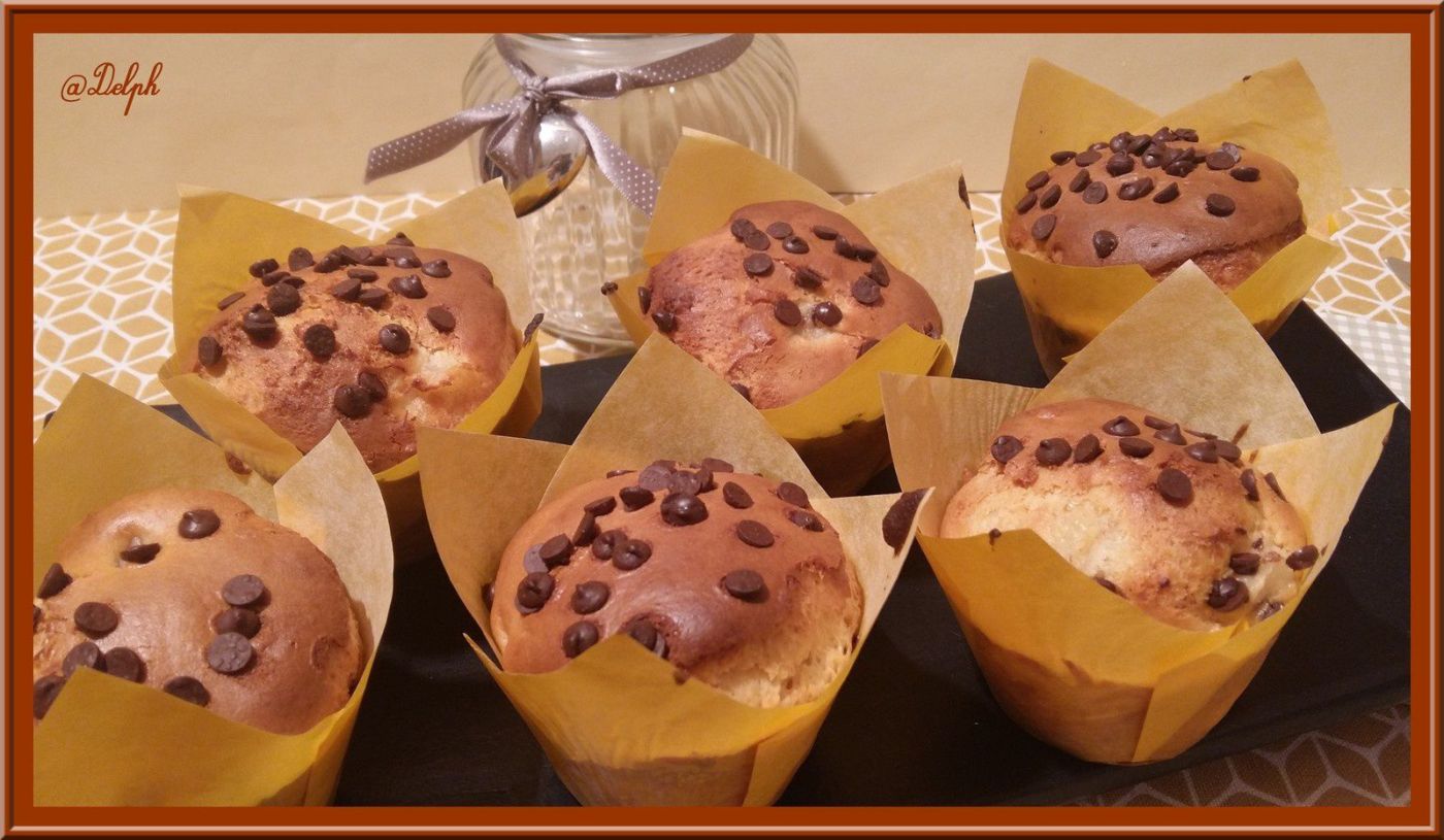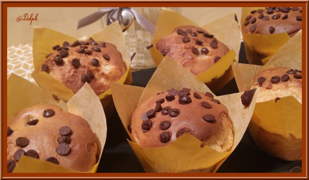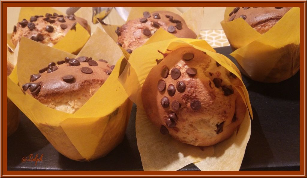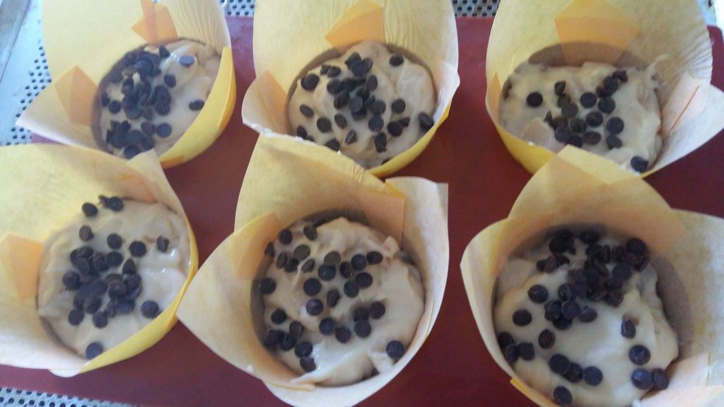- Remplir les caissettes à Muffins de pâte jusqu’au 2/3, parsemer de pépites de chocolat.