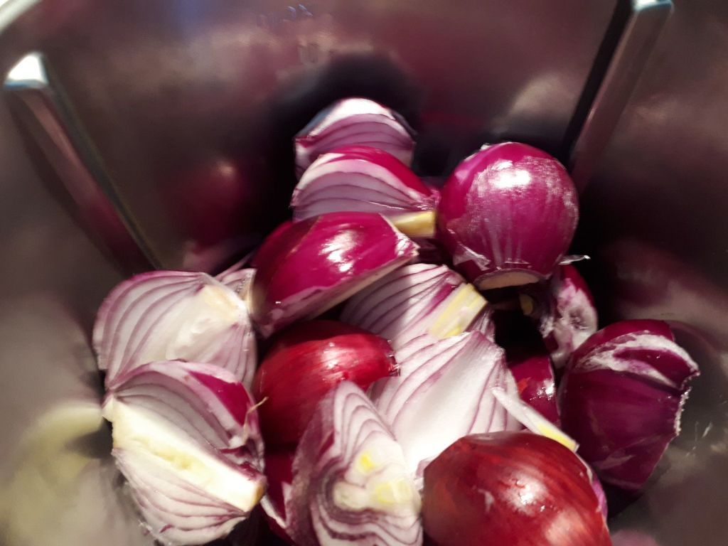 - Éplucher et couper en 4 vos oignons, les mettre dans le bol et mixer 5sec/vit5. Bien racler les parois du bol à l’aide de la spatule.