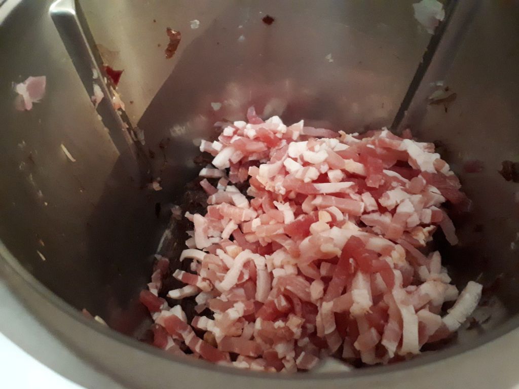 - Ajouter le beurre, le vinaigre et le miel puis faire chauffer 38min/Varoma/vit1 ( à surveiller). A la sonnerie, racler les bords puis ajouter les lardons et continuer la cuisson 3 min/100°C/couteau inversé/vit1.