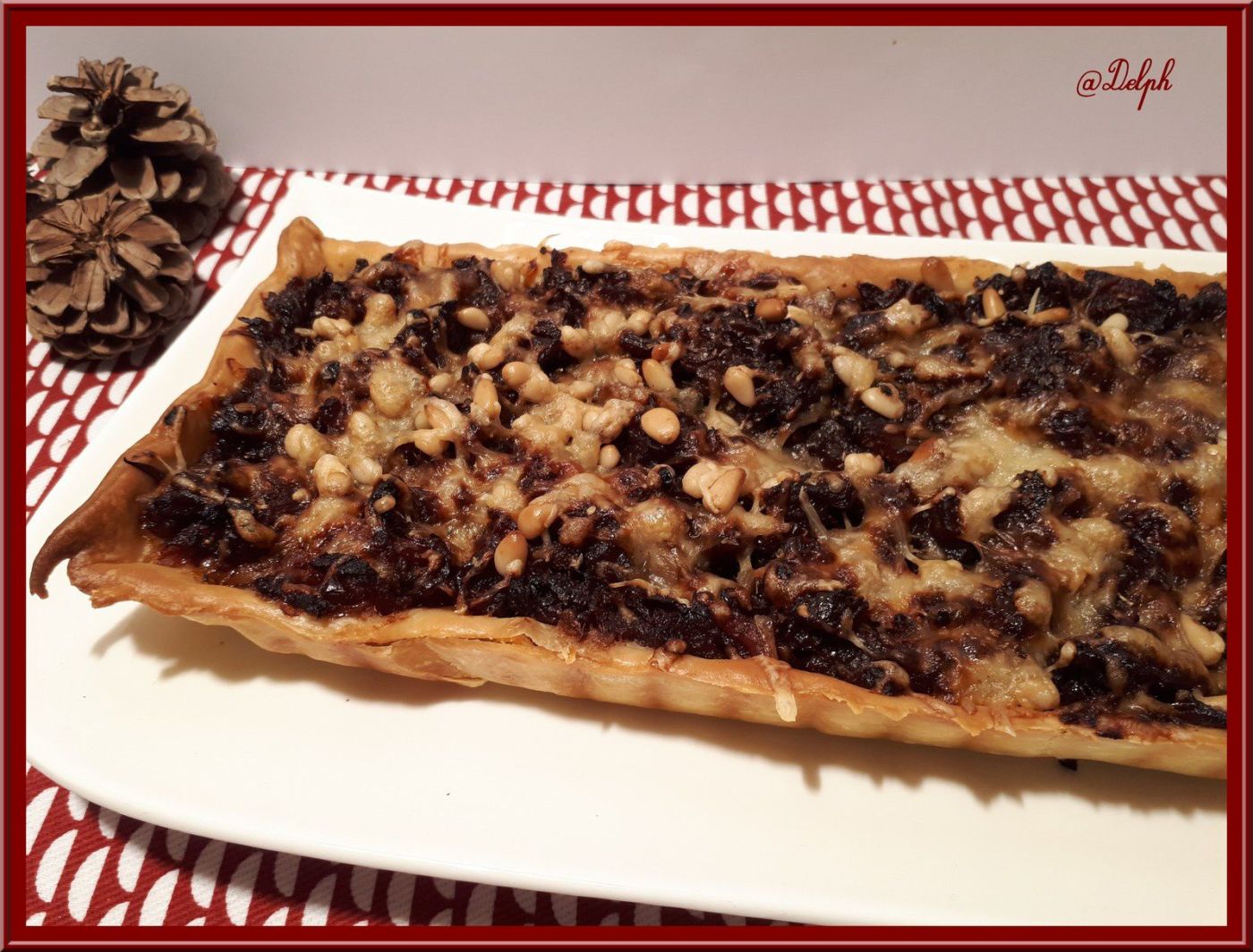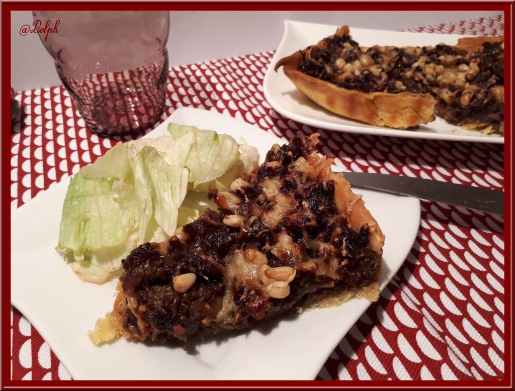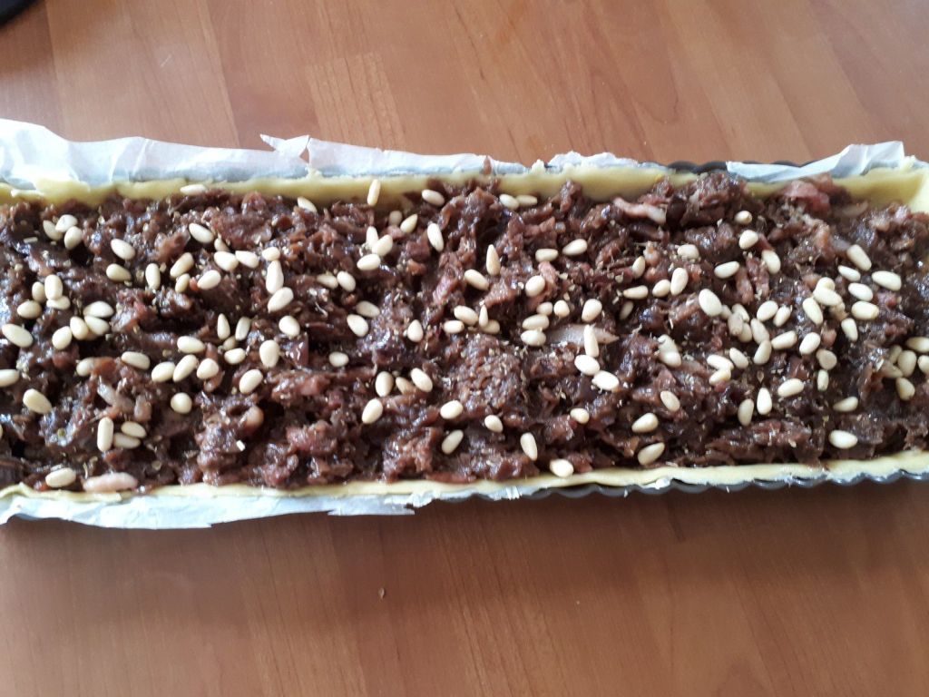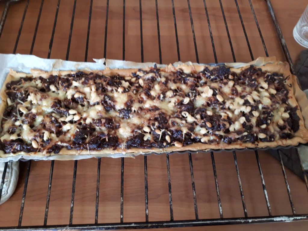 - Étaler la pâte à tarte et en foncer un moule, garnir avec la préparation aux oignons et lardons et les pignons.