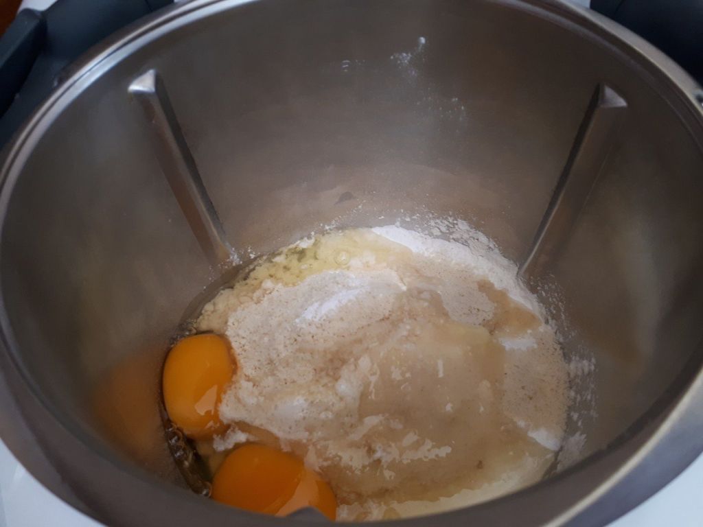 - Dans le bol, mettre la farine, le sucre, la poudre d’amande, le beurre, la levure, l’extrait d’anis, les œufs puis mettre en mode pétrin 3min30.