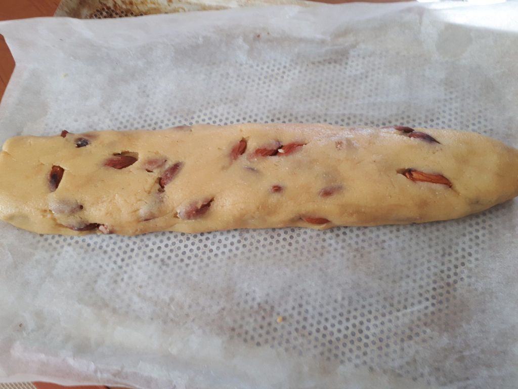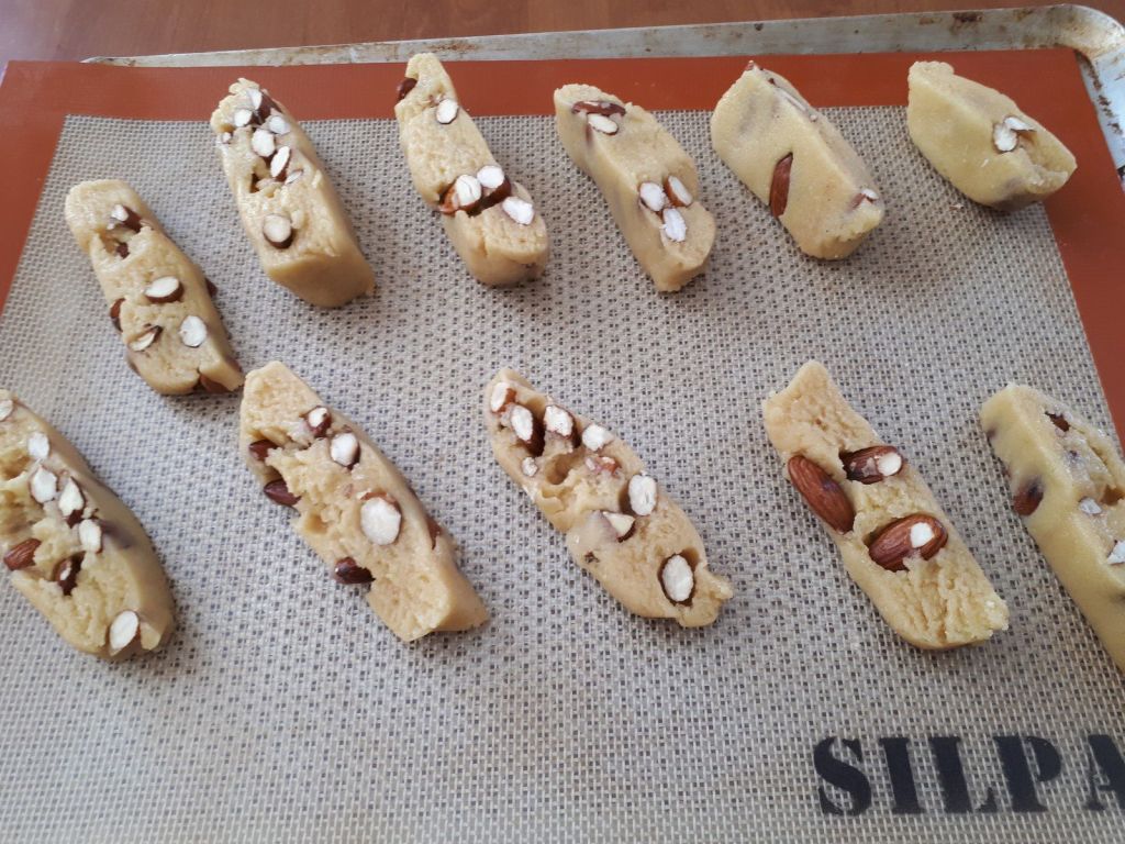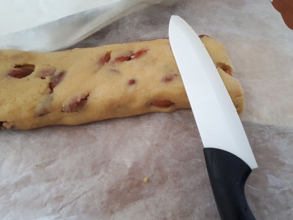 - A la sonnerie, verser la pâte sur un papier sulfurisé puis ajouter les amandes torréfiées, former un boudin, puis le placer 1 heure au frais.