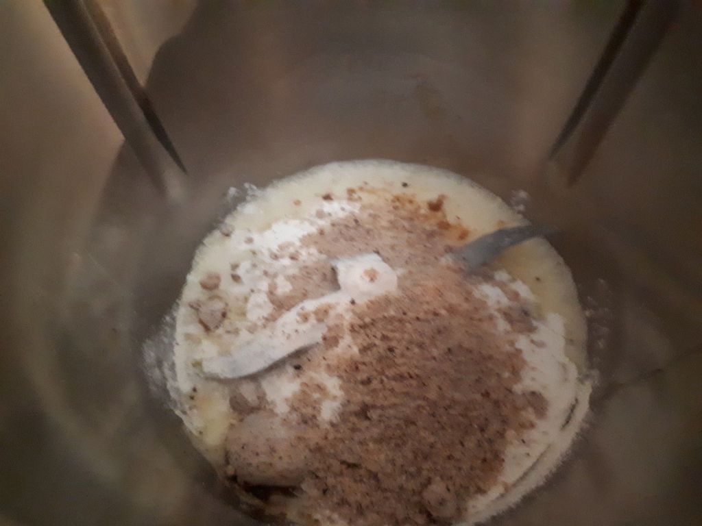 - Mettre les œufs, le sucre vanillé et l’extrait de vanille dans le bol et mélanger 1min/vit3, ajouter les noisettes en poudre avec la levure et la farine puis mélanger 30sec/vit3.